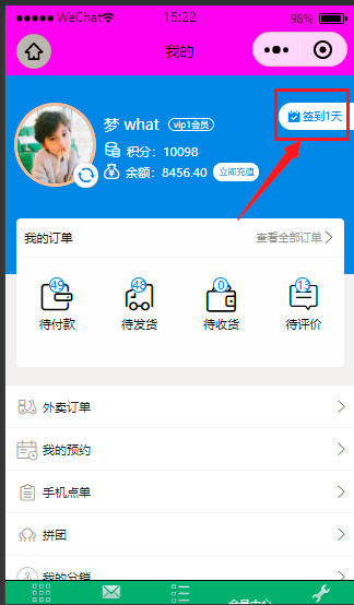 签到 需要用户登陆会员中心点击 签到送积分