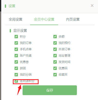 小程序编辑器-设置-会员设置中心增加“签到送积分”,可在后台-营销活动-活动设置-增加签到分享活动,用来增加小程序用户粘性,如下图: